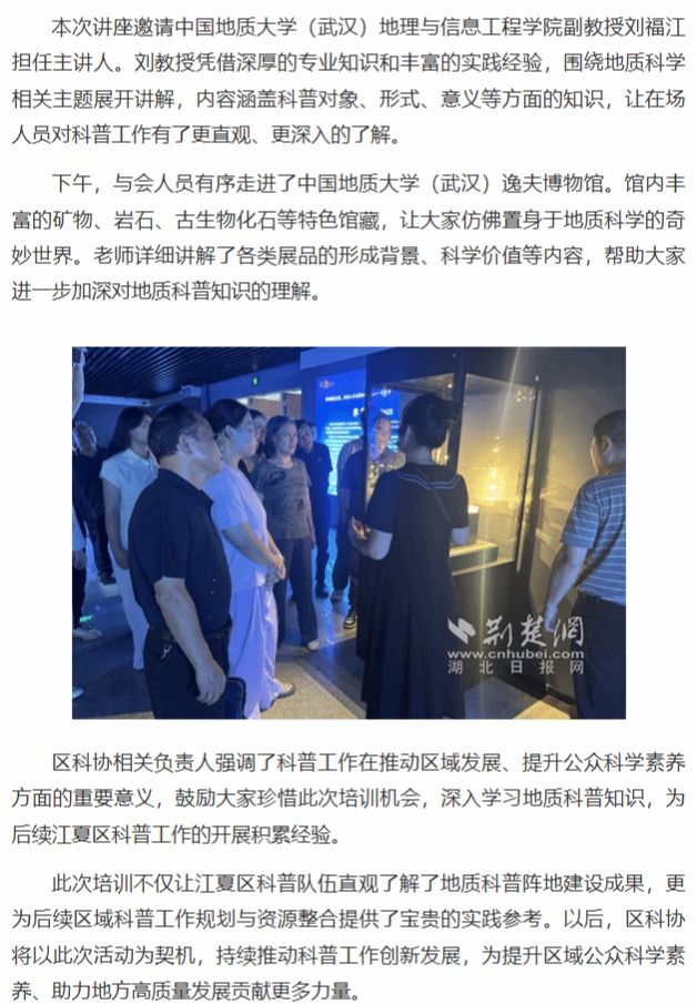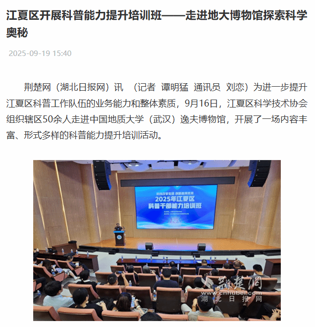 为进一步提升江夏区科普工作队伍的业务能力和整体素质,9月16日,江夏区科学技术协会组织辖区50余人走进中国地质大学(武汉)逸夫博物馆,开展了一场内容丰富、形式多样的科普能力提升培训活动。