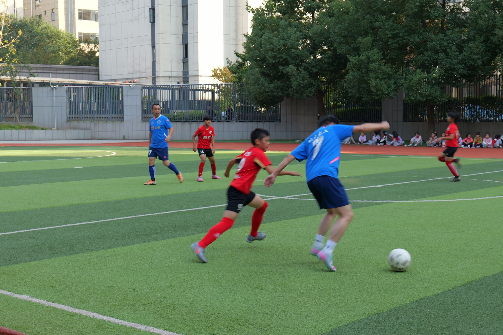 随后,我校教工足球队和西大街小学足球队开展了一场激动人心的足球赛。