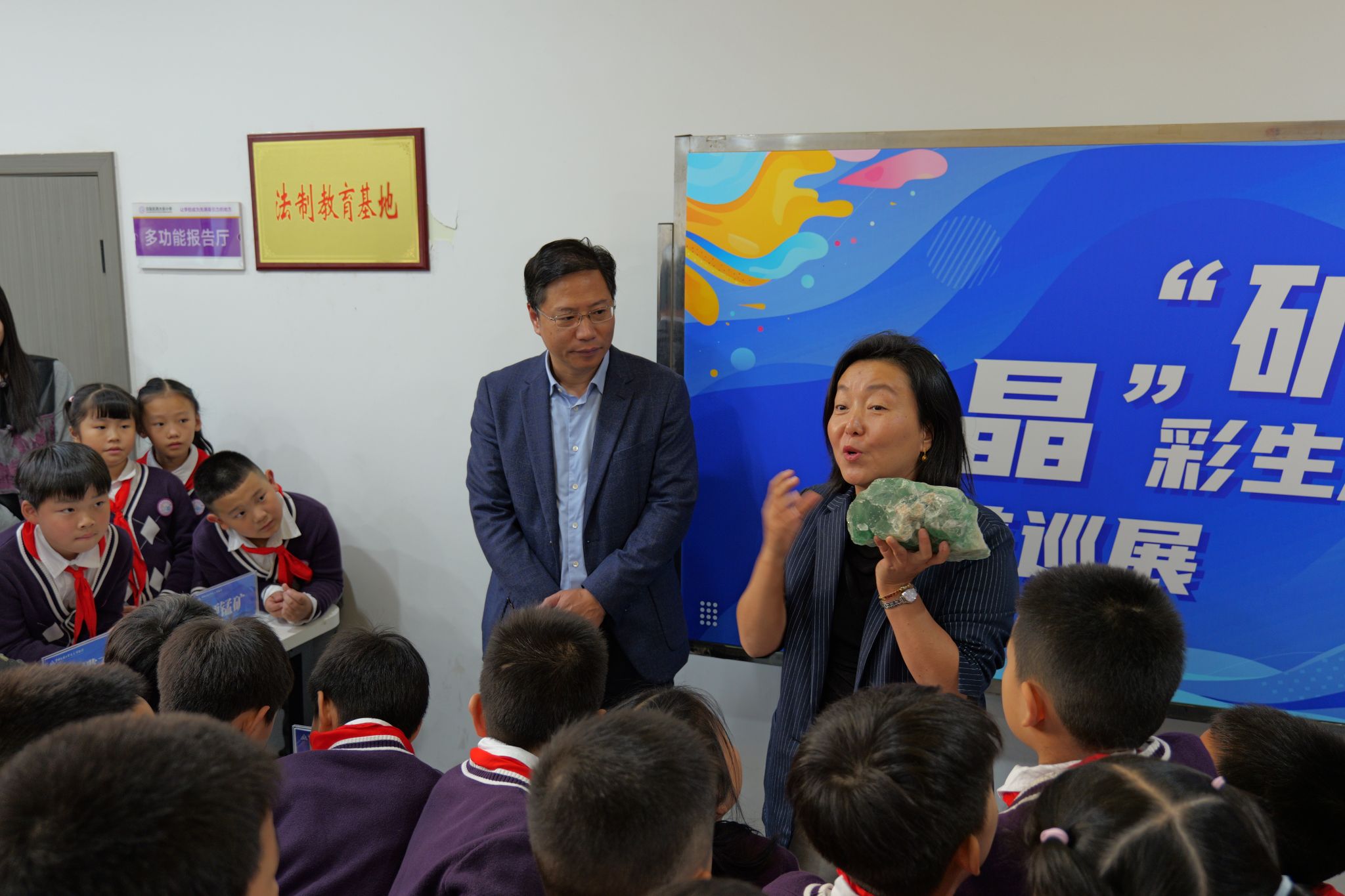 在科普巡展环节,逸夫博物馆向小学生们展示了萤石、肾状赤铁矿、石英、膨润土、锂云母等十余块馆藏矿物标本,学生们通过近距离观察、触摸与提问,真正实现了“做中学、玩中悟”。