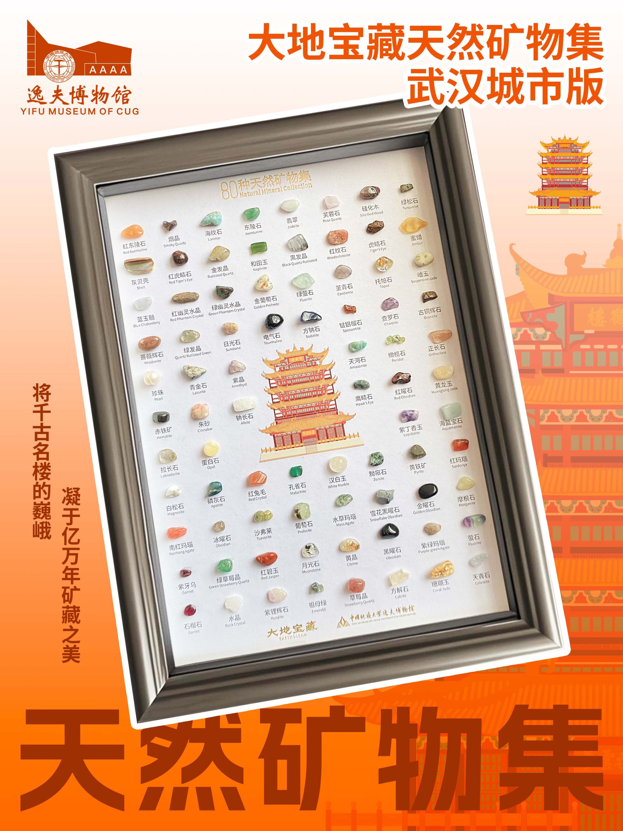 《大地宝藏天然矿物集(武汉城市版)》是一款将地球科学与城市美学深度融合的文创精品,分为黑白两款。主办方精心甄选了采自全球的80种天然矿物,每一块都是亿万年地质作用的结晶。同时将黄鹤楼的建筑元素融入设计,旨在将古老的地质文化与璀璨的江城文脉相互呼应,带给每一位追求品味与文化的消费者,成为连接自然与城市记忆的独特桥梁。