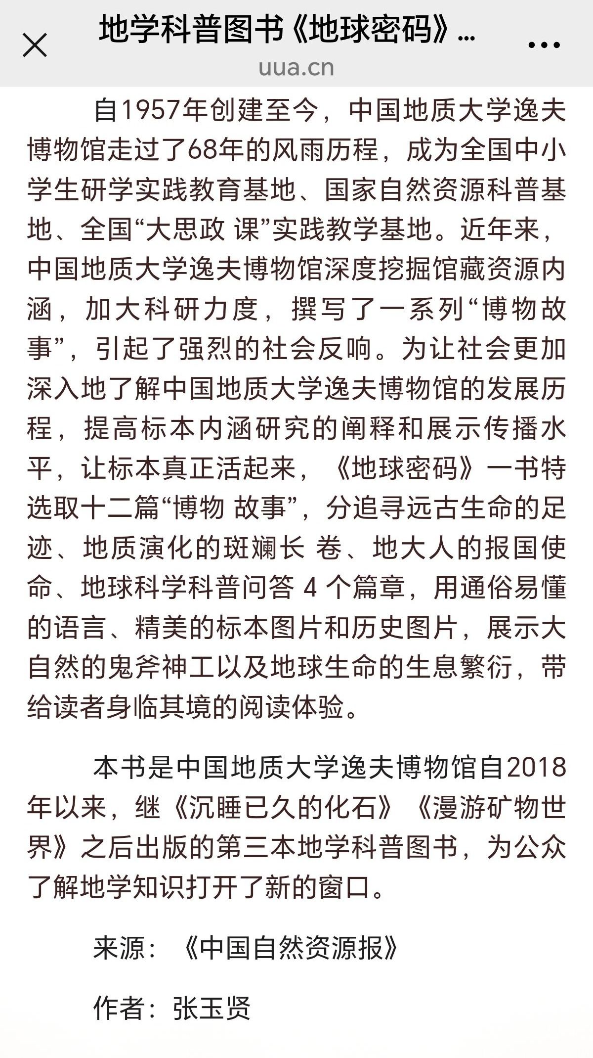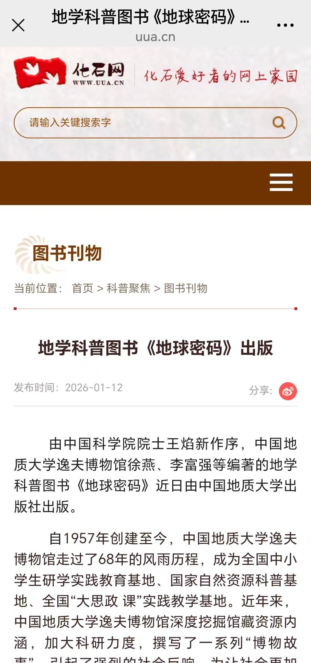由中国科学院院士王焰新作序,中国地质大学逸夫博物馆徐燕、李富强等编著的地学科普图书《地球密码》近日由中国地质大学出版社出版。