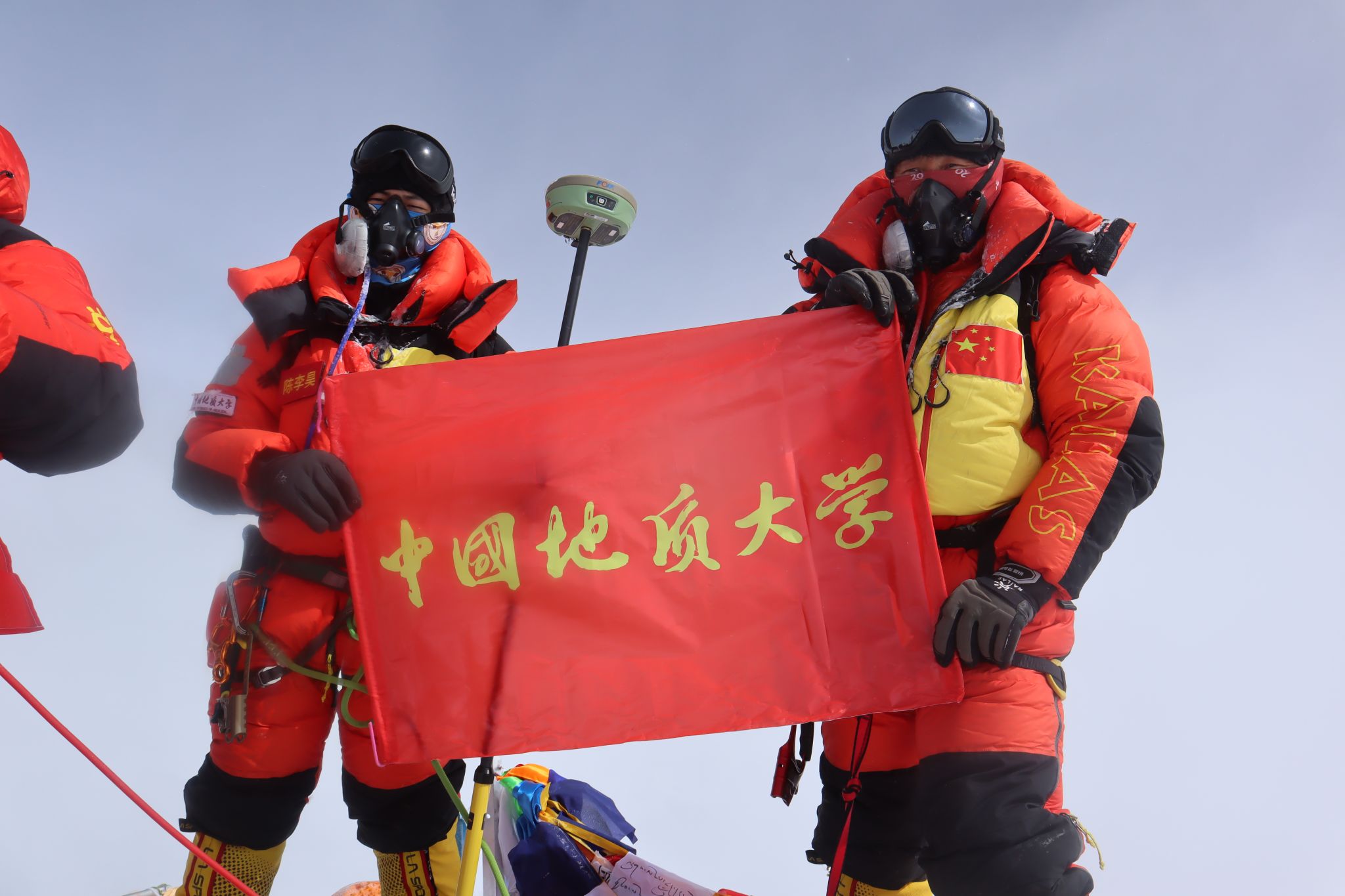 2022年5月,陈刚(右)和儿子将中国地质大学校旗带上世界之巅