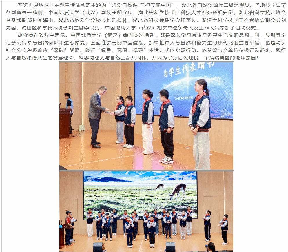 启动仪式上,薛明为学生代表送上地学科普书籍《地球密码》,为孩子们打开探索地球的大门。来自地大附属学校的同学们化身环保小使者,用舞台剧《种下希望,点亮家园》讲述草原守护故事,一曲《绿意同心,致敬地球》唱响对地球的告白,诗歌《生命之树,守护地球》饱含对自然的热爱。学生代表董加洋发出倡议,号召大家从节约一滴水、捡起一片垃圾做起,用行动守护美丽家园。在嘉宾与学生代表的共同见证下,本次主题宣传活动正式启动。