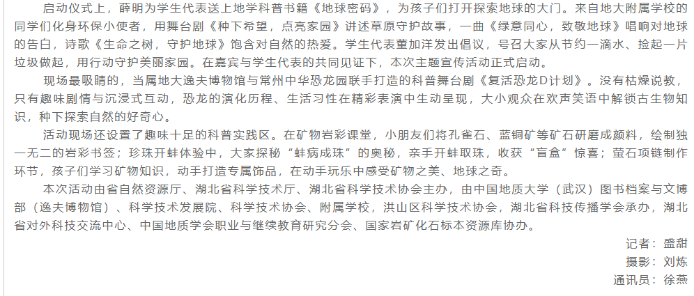 本次活动由省自然资源厅、湖北省科学技术厅、湖北省科学技术协会主办,由中国地质大学(武汉)图书档案与文博部(逸夫博物馆)、科学技术发展院、科学技术协会、附属学校,洪山区科学技术协会,湖北省科技传播学会承办,湖北省对外科技交流中心、中国地质学会职业与继续教育研究分会、国家岩矿化石标本资源库协办。