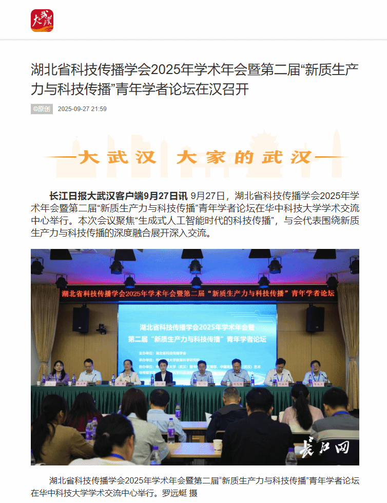 9月27日,湖北省科技传播学会2025年学术年会暨第二届“新质生产力与科技传播”青年学者论坛在华中科技大学学术交流中心举行。本次会议聚焦“生成式人工智能时代的科技传播”,与会代表围绕新质生产力与科技传播的深度融合展开深入交流。