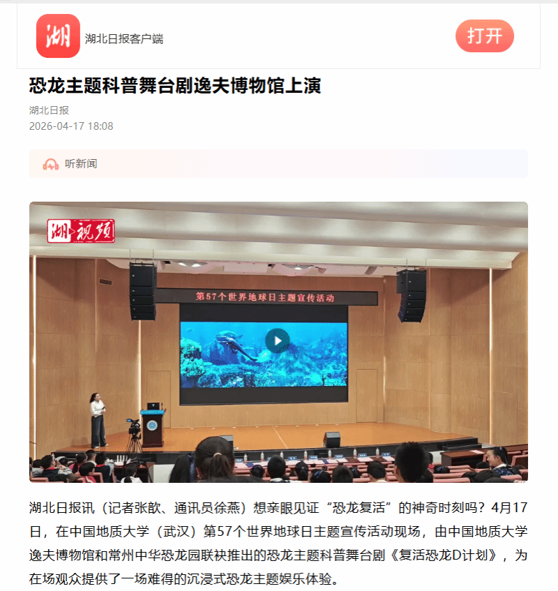 想亲眼见证“恐龙复活”的神奇时刻吗?4月17日,在中国地质大学(武汉)第57个世界地球日主题宣传活动现场,由中国地质大学逸夫博物馆和常州中华恐龙园联袂推出的恐龙主题科普舞台剧《复活恐龙D计划》,为在场观众提供了一场难得的沉浸式恐龙主题娱乐体验。