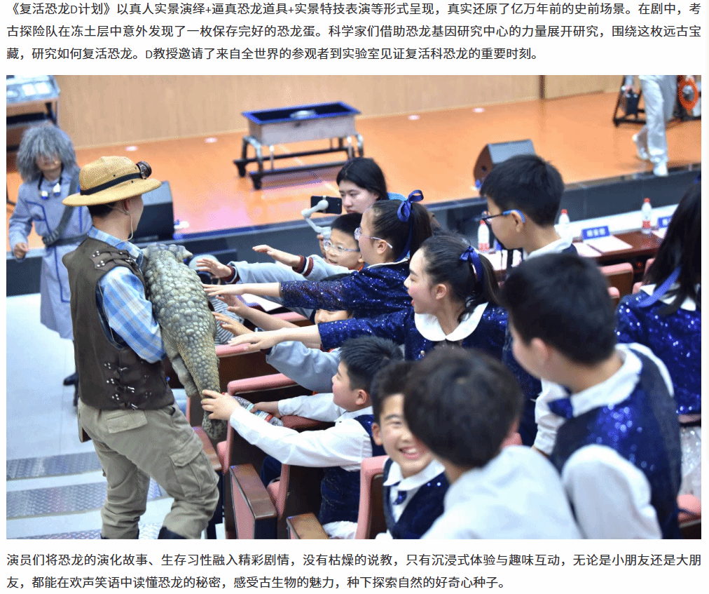 演员们将恐龙的演化故事、生存习性融入精彩剧情,没有枯燥的说教,只有沉浸式体验与趣味互动,无论是小朋友还是大朋友,都能在欢声笑语中读懂恐龙的秘密,感受古生物的魅力,种下探索自然的好奇心种子。