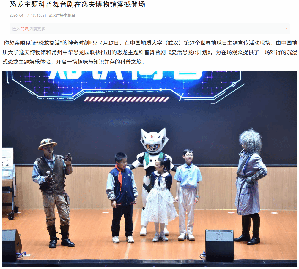 你想亲眼见证“恐龙复活”的神奇时刻吗?4月17日,在中国地质大学(武汉)第57个世界地球日主题宣传活动现场,由中国地质大学逸夫博物馆和常州中华恐龙园联袂推出的恐龙主题科普舞台剧《复活恐龙D计划》,为在场观众提供了一场难得的沉浸式恐龙主题娱乐体验,开启一场趣味与知识并存的科普之旅。