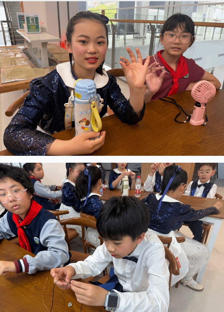 在萤石项链手工区,小朋友们变身小小设计师。先跟着老师认识萤石的小秘密——它的形状、颜色和光学小知识,然后拿起砂纸认真打磨。圆滚滚的、方方正正的、八面体的……一块块萤石被打磨成可爱模样。穿绳、绕铜丝,一条条专属萤石项链新鲜出炉,大家戴在脖子上,对着阳光看来看去,个个爱不释手。