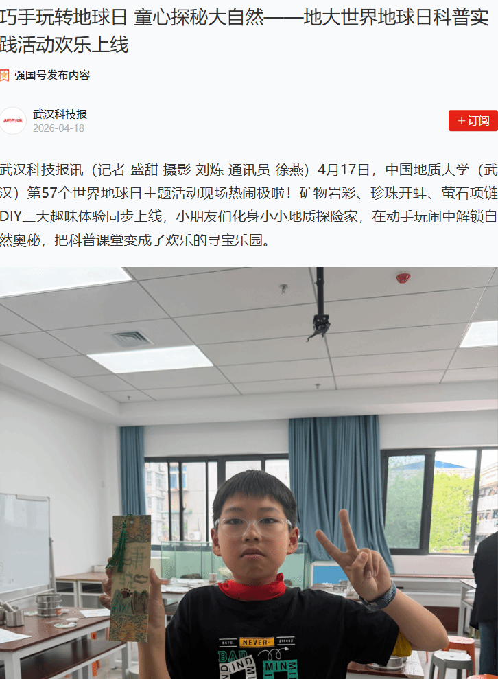 4月17日,中国地质大学(武汉)第57个世界地球日主题活动现场热闹极啦!矿物岩彩、珍珠开蚌、萤石项链DIY三大趣味体验同步上线,小朋友们化身小小地质探险家,在动手玩闹中解锁自然奥秘,把科普课堂变成了欢乐的寻宝乐园。
