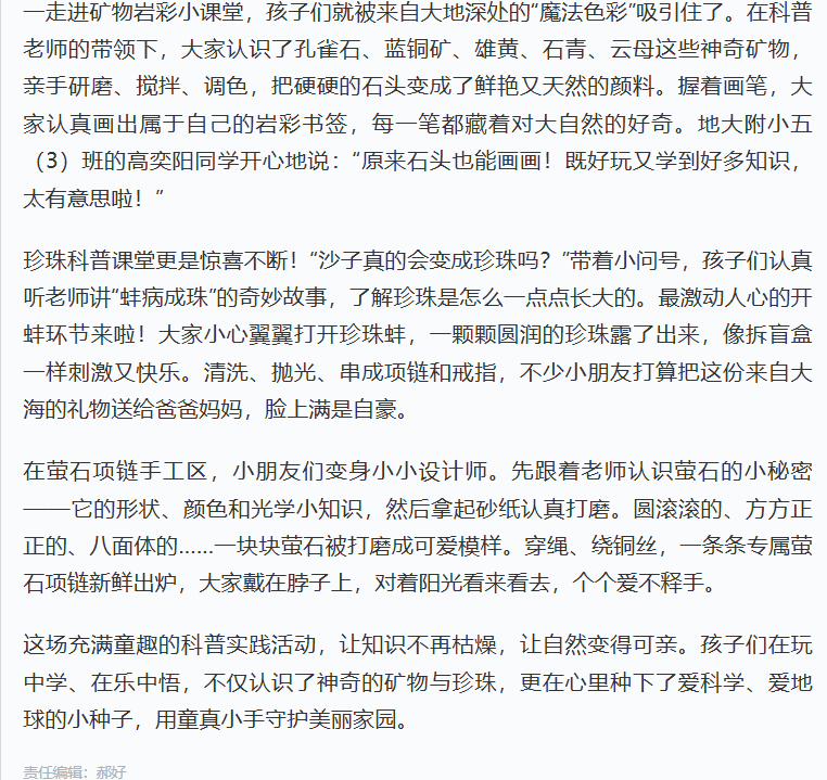 这场充满童趣的科普实践活动,让知识不再枯燥,让自然变得可亲。孩子们在玩中学、在乐中悟,不仅认识了神奇的矿物与珍珠,更在心里种下了爱科学、爱地球的小种子,用童真小手守护美丽家园。