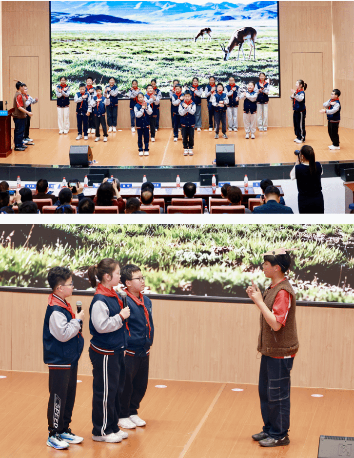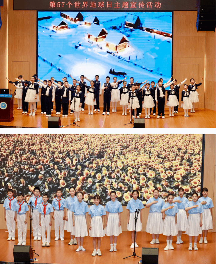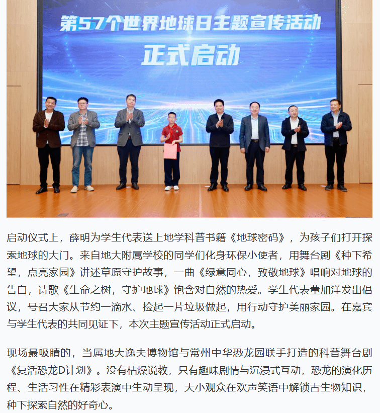 启动仪式上,薛明为学生代表送上地学科普书籍《地球密码》,为孩子们打开探索地球的大门。来自地大附属学校的同学们化身环保小使者,用舞台剧《种下希望,点亮家园》讲述草原守护故事,一曲《绿意同心,致敬地球》唱响对地球的告白,诗歌《生命之树,守护地球》饱含对自然的热爱。学生代表董加洋发出倡议,号召大家从节约一滴水、捡起一片垃圾做起,用行动守护美丽家园。在嘉宾与学生代表的共同见证下,本次主题宣传活动正式启动。