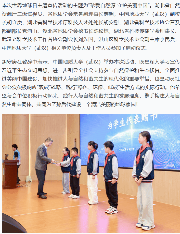 本次世界地球日主题宣传活动的主题为“珍爱自然源 守护美丽中国”。湖北省自然资源厅二级巡视员、省地质学会常务副理事长薛明,中国地质大学(武汉)副校长胡守庚,湖北省科学技术厅科技人才处处长胡安慰,湖北省科学技术协会普及部副部长党海山、湖北省地质学会秘书长陈松林,湖北省科技传播学会理事长、武汉老科学技术工作者协会副会长刘先国,洪山区科学技术协会副主席李民兵,中国地质大学(武汉)相关单位负责人及工作人员参加了启动仪式。