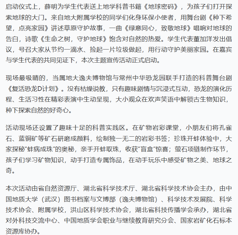 本次活动由省自然资源厅、湖北省科学技术厅、湖北省科学技术协会主办,由中国地质大学(武汉)图书档案与文博部(逸夫博物馆)、科学技术发展院、科学技术协会、附属学校,洪山区科学技术协会,湖北省科技传播学会承办,湖北省对外科技交流中心、中国地质学会职业与继续教育研究分会、国家岩矿化石标本资源库协办。