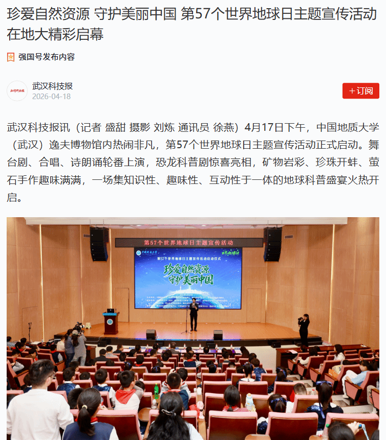4月17日下午,中国地质大学(武汉)逸夫博物馆内热闹非凡,第57个世界地球日主题宣传活动正式启动。舞台剧、合唱、诗朗诵轮番上演,恐龙科普剧惊喜亮相,矿物岩彩、珍珠开蚌、萤石手作趣味满满,一场集知识性、趣味性、互动性于一体的地球科普盛宴火热开启。