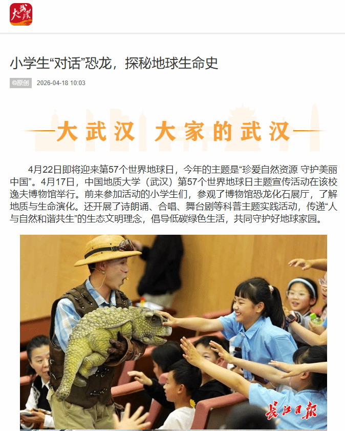 4月22日即将迎来第57个世界地球日,今年的主题是“珍爱自然资源 守护美丽中国‌”。4月17日,中国地质大学(武汉)第57个世界地球日主题宣传活动在该校逸夫博物馆举行。前来参加活动的小学生们,参观了博物馆恐龙化石展厅,了解地质与生命演化。还开展了诗朗诵、合唱、舞台剧等科普主题实践活动,传递“人与自然和谐共生”的生态文明理念,倡导低碳绿色生活,共同守护好地球家园。